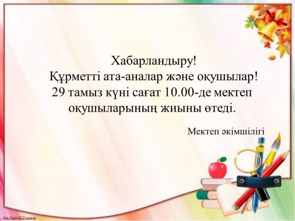 29 қыркүйек сағат 10:00-де мектеп оқушыларының жиыны өтеді.