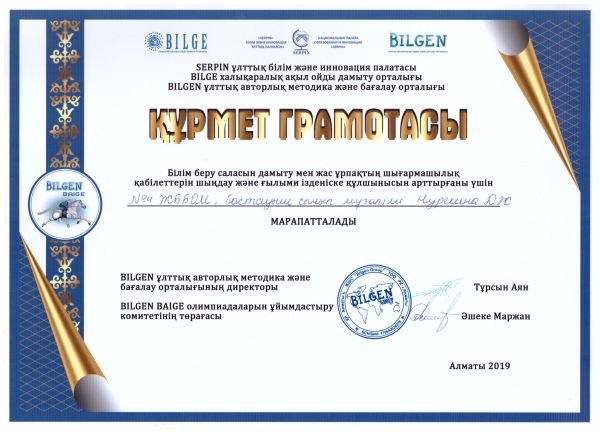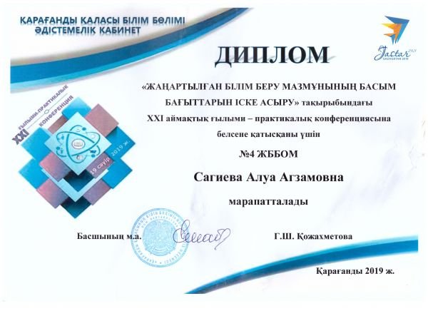 "ЖАҢАРТЫЛҒАН БІЛІМ БЕРУ МАЗМҰНЫНЫҢ БАСЫМ БАҒЫТТАРЫН ІСКЕ АСЫРУ" тақырыбындағы ХХІ аймақтық ғылыми-практикалық конференциясына белсене қатысқаны үшін мектебіміздің орыс тілі мен әдебиеті пә…