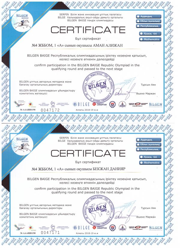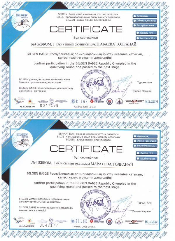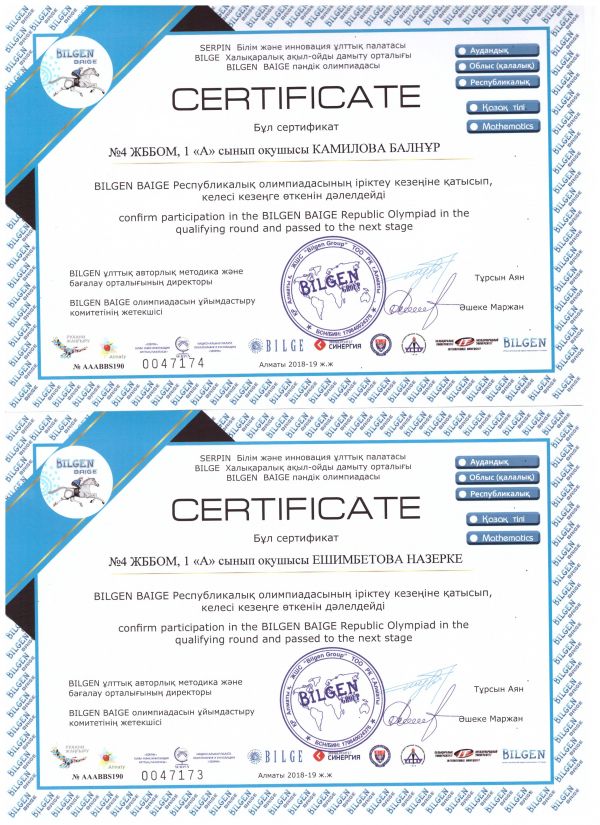 BILGEN BAIGE республикалық олимпиадасының іріктеу кезеңінен өтіп, мектебіміздің 1 сынып оқушылары Сайлаубек Аида, Балтабаева Толғанай, Маратова Толғанай, Аманжол Муслим, Тұрлыбек Аруна, Аман Алижан,…