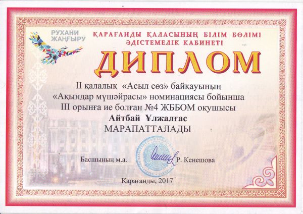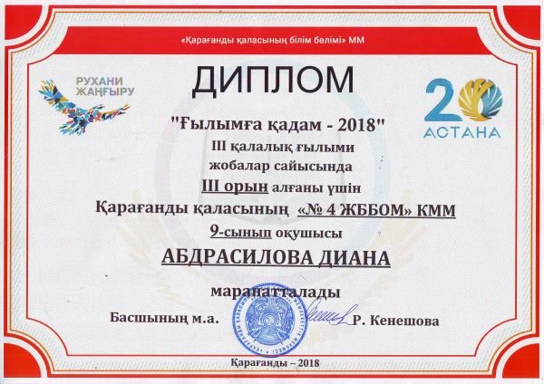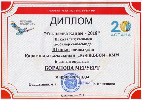 За занятые 3 места на ІІІ городском соревновании научных проектов ученицы 9 класса Абдрасилова Д и 6 класса Боранова М.нашей школы были награждены дипломом отдела образования города Караганды.
