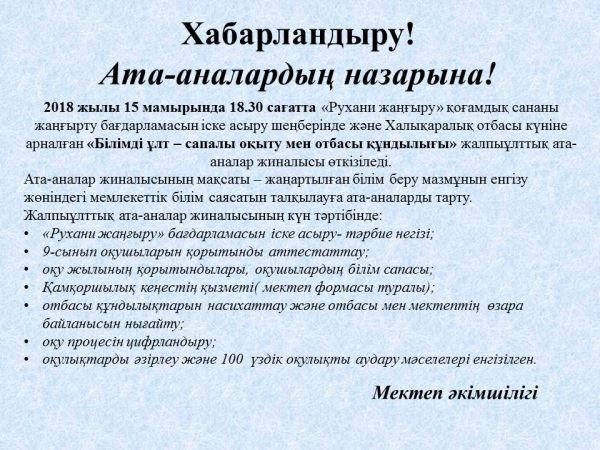 В 18.30 15 мая по СОШ № 4 С родителями учеников будет проведено общенациональное собрание «Білімді ұлт – сапалы оқыту мен отбасы құндылығы»  посвященный Международно…