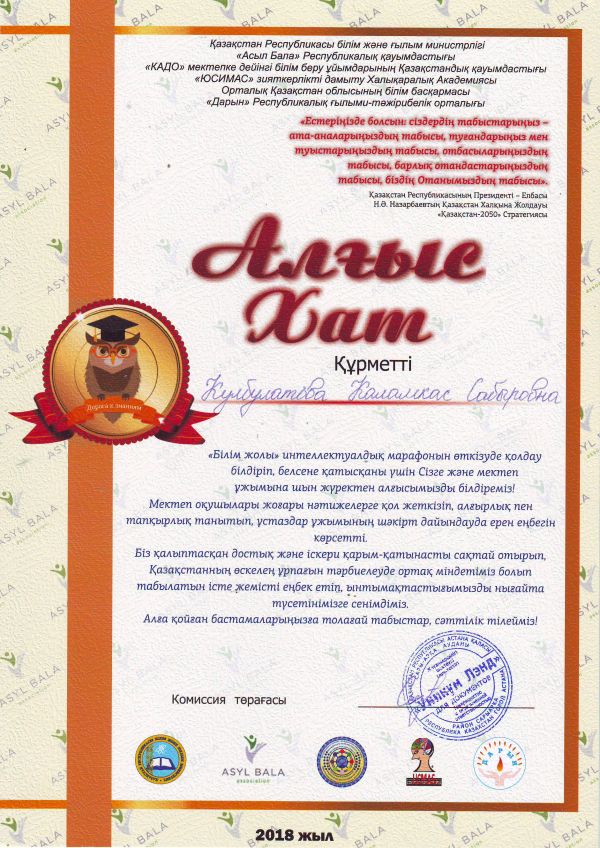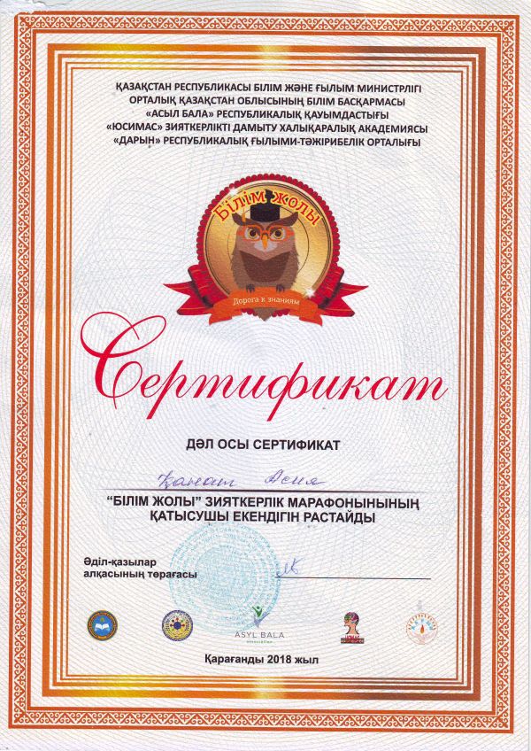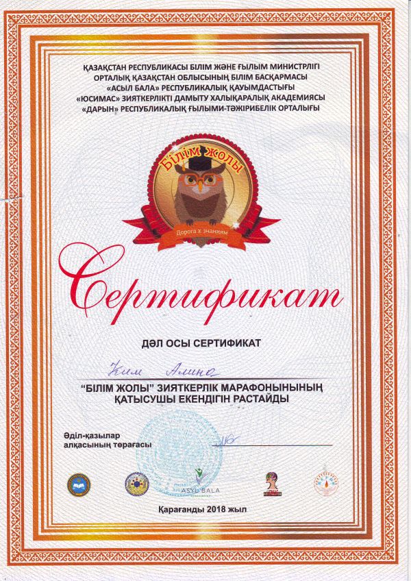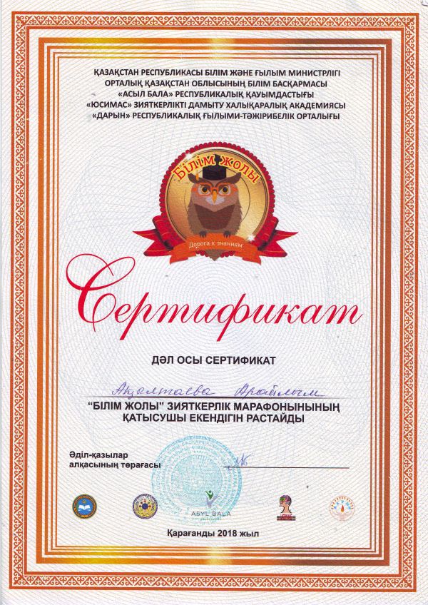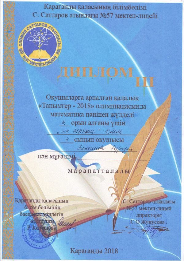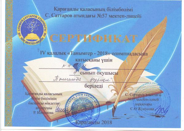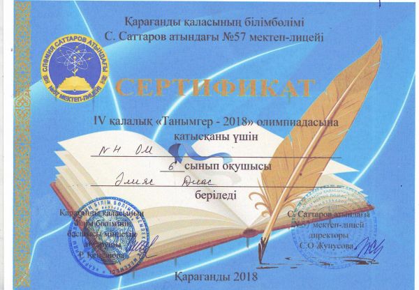 За участие в ІV городской олимпиаде «Танымгер-2018» ученики 4  класса Төлегенова Н, 5 класса Сағынтаева А., 6 класса  Әлияс Д. получили сертификаты. В этом соревновании ученица…