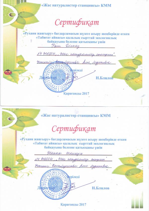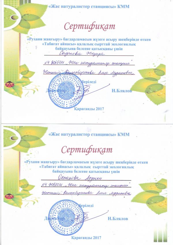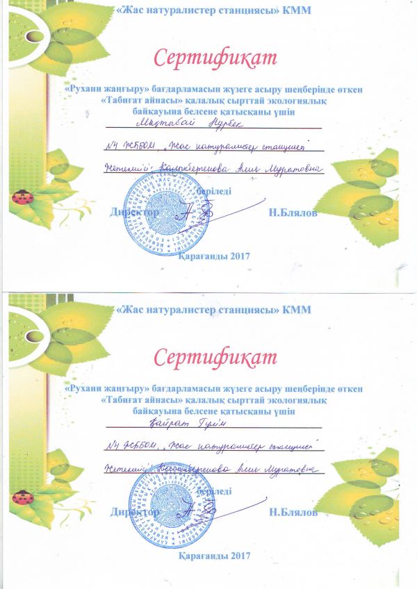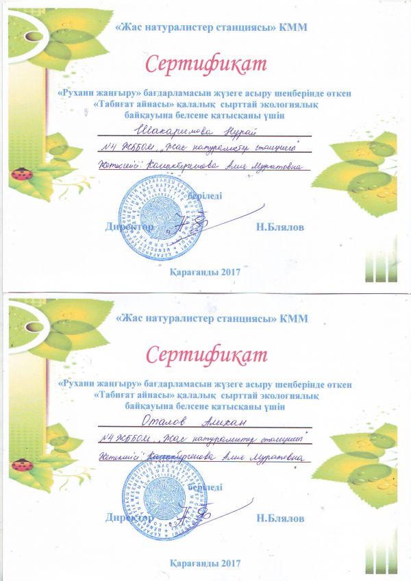 Пр программе «Рухани жаңғыру» посвященной загородной экологии сетификатами были отмечены ученики школы.