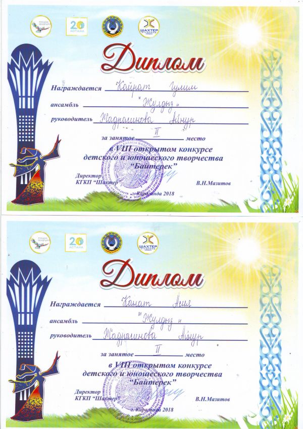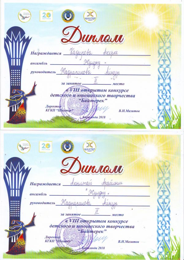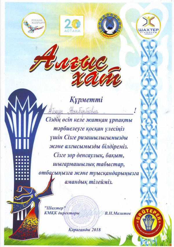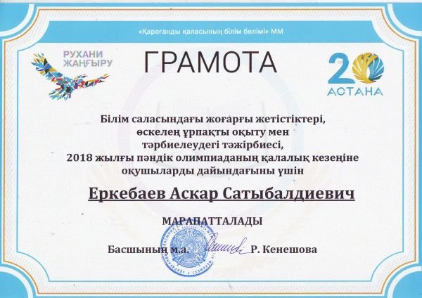 За высокие достижения, воспитание и обучение будущего поколения за подготовку в 2018 предметной олимпиады школьников учитель истории Еркебаев А.С и учитель казахского языка и литературы Шүкірх…