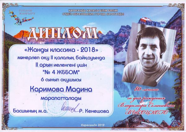 На 2 городском смотре отличников «Живая классика-2018» ученики 8 класса Маралова М. и 6 класса Каримова М награждены дипломом 2 степени.