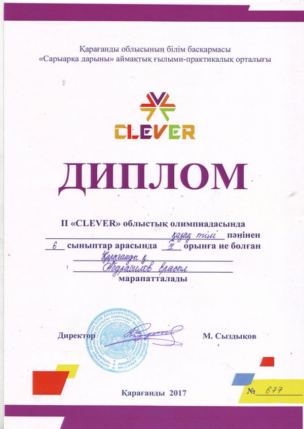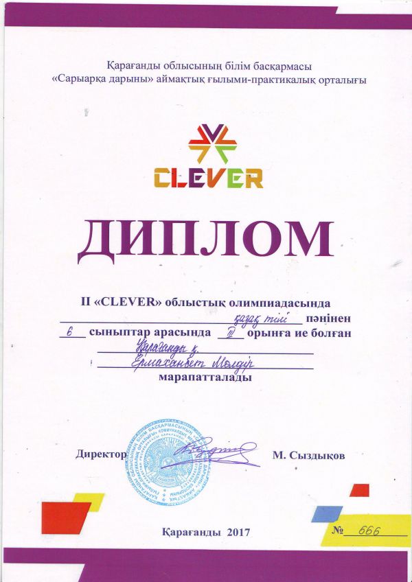 Қазақ тілі пәнінен 6 сыныптар арасында ІІ «CLEVER» облыстық олимпиадасында мектебіміздің оқушылары Ермаханбет М. Және Абдрасилов Ерасыл қатысып, Қарағанды облысы білім басқармасы «…