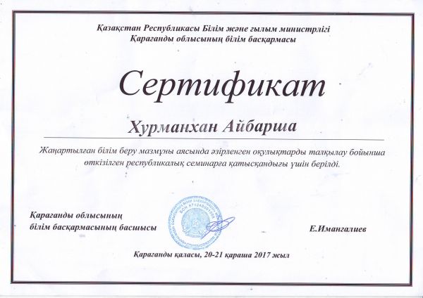 Жаңартылған білім беру мазмұны аясында әзірленген оқулықтарды талқылау бойынша өткізілген республикалық семинарға қатысқандығы үшін мектебіміздің мұғалімі Хурманхан А. сертификатқа ие болды.