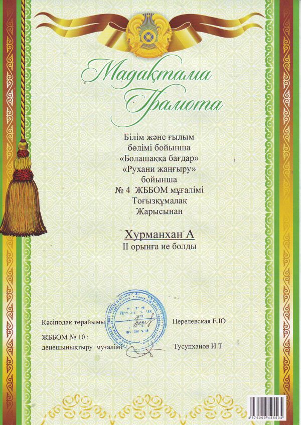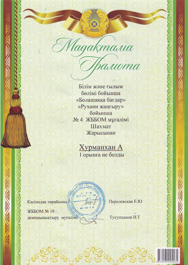 Білім және ғылым бөлімі бойынша "Болашаққа бағдар", "Рухани жаңғыру" бойынша №4 ЖББОМ мұғалімі Хурманхан А. тоғызқұмалақ жарысынан ІІ орынға, ал шахмат бойынша І орын алғаны үшін…