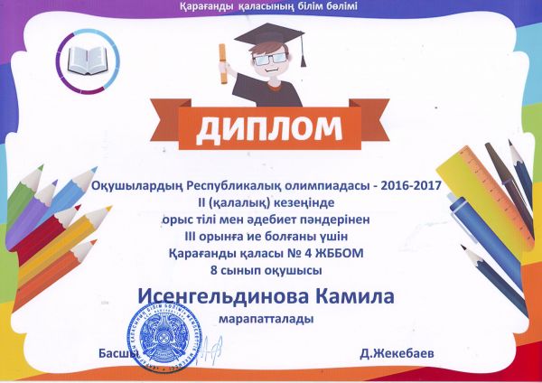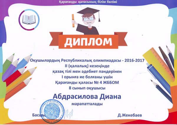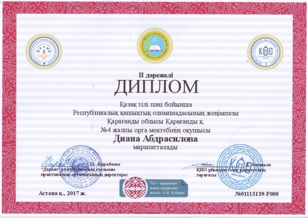 Қазақ тілі пәні бойынша Республикалық қашықтық олимпиадасының жеңімпазы мектебіміздің 8 сынып оқушысы Абдрасилова Д. ІІ дәрежелі дипломмен марапатталды. Сонымен қатар 8 сынып оқушысы Күрішбаева А. ж…