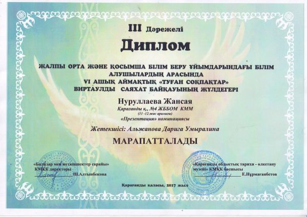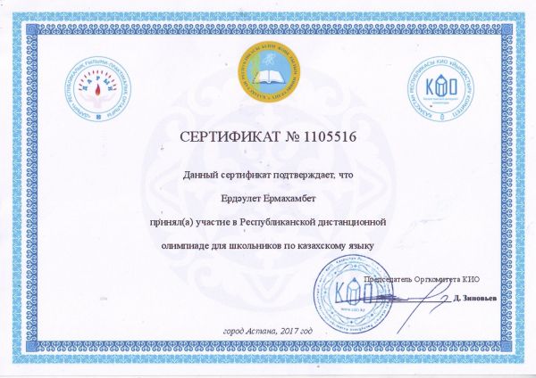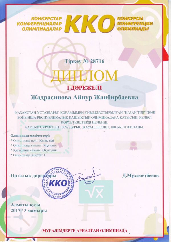 "Қазақстан ұстаздары" қоғамымен ұйымдастырылған "Қазақ тілі" пәні бойынша республикалық қашықтық олимпиадаларға қатысып, І дәрежелі дипломға ие болды.