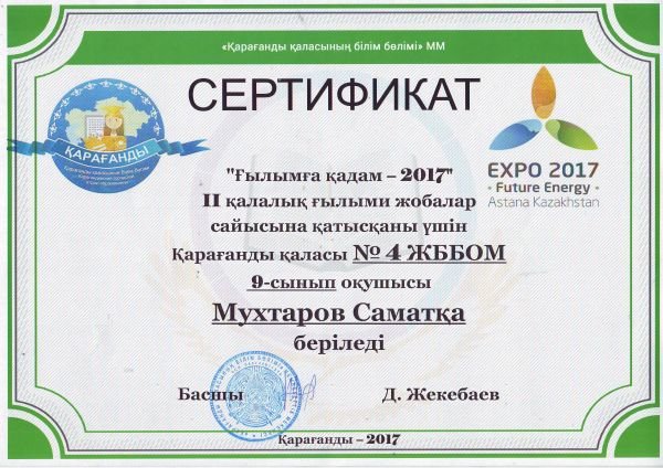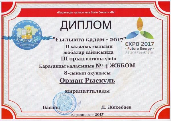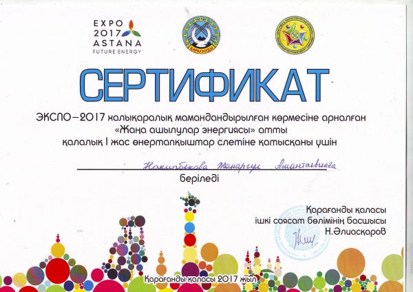 ЭКСПО-2017 халықаралық мамандандырылған көрмесіне арналған «Жаңа ашылулар энергиясы» атты қалалық І жас өнертапқыштар слетіне қатысқаны үшін 8 сынып оқушысы Абдрасилова Диана және жетекш…