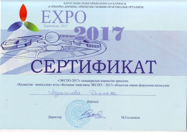 «Экспо-2017» халықаралық көрмесіне арналған «Қазақстан-менің елім» атты «Болашақ энергиясы ЭКСПО-2017» облыстық көрме форумына қатысқандары үшін Абдрасилова Диана…