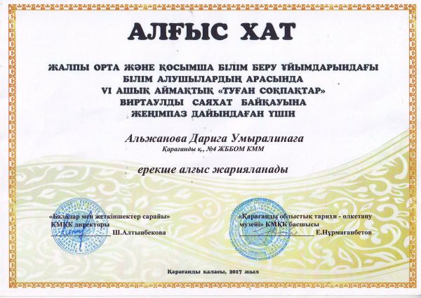 Жалпы, орта және қосымша білім беру ұйымдарындағы білім алушылардың арасында VI ашық аймақтық «Туған соқпақтар» виртуалды саяхат байқауының жүлдегері 7 сынып оқушысы Нуруллаева Жансая ІІ…