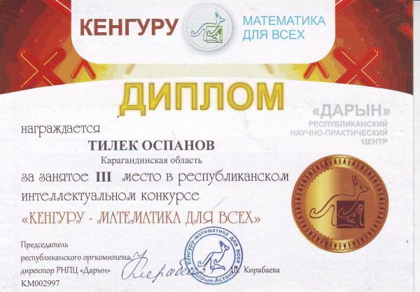 «КЕНГУРУ МАТЕМАТИКА ДЛЯ ВСЕХ» интеллектуалдық конкурсына қатысып ІІІ орын алғаны үшін 6 сынып оқушысы Оспанов Тілек дипломмен марапатталды.