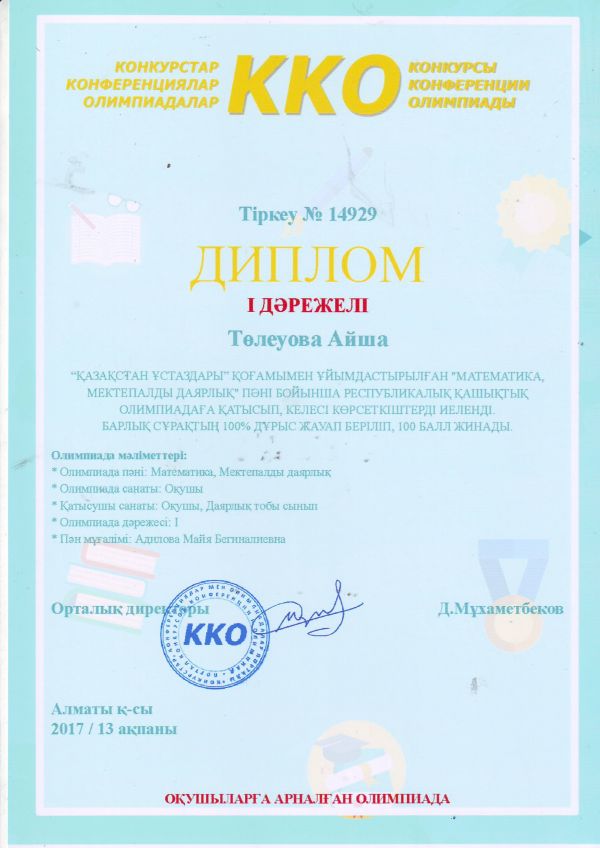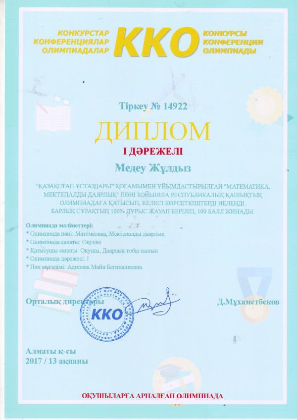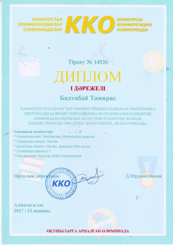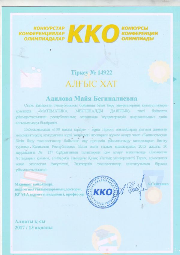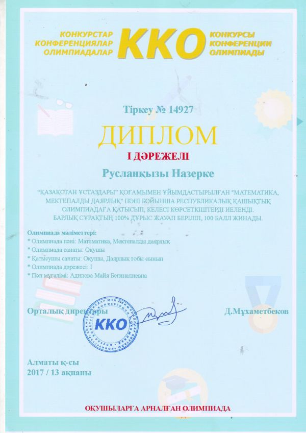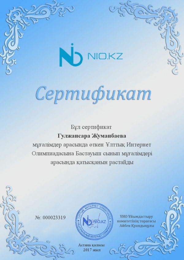 Nio.kz зияткерлік олимпиадасына қатысқаны үшін, бастауыш сынып мұғалімі Гулжансара Жуманбаева марапатталды.