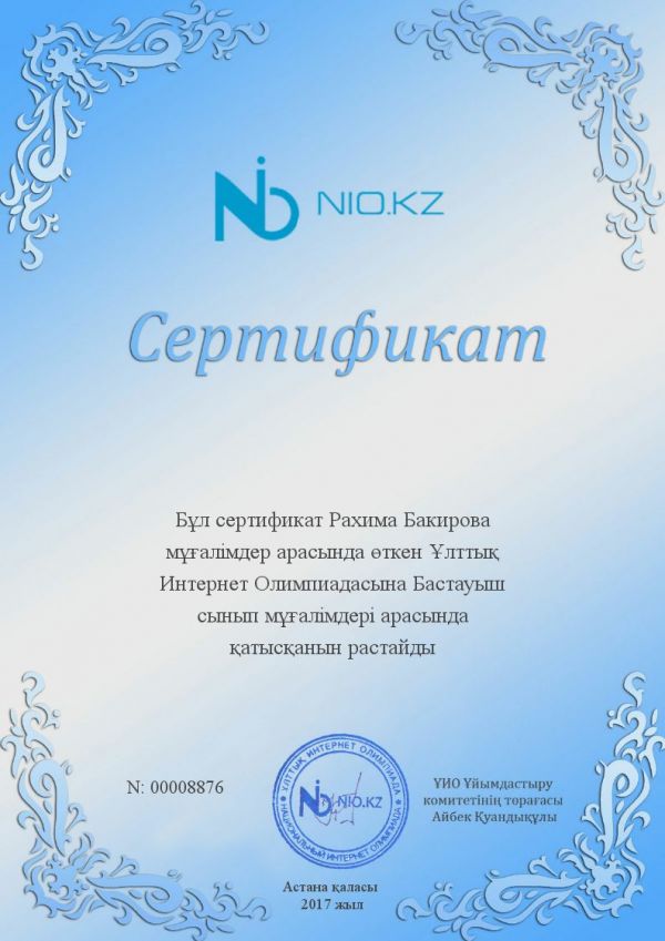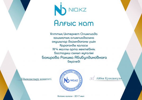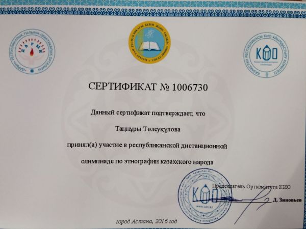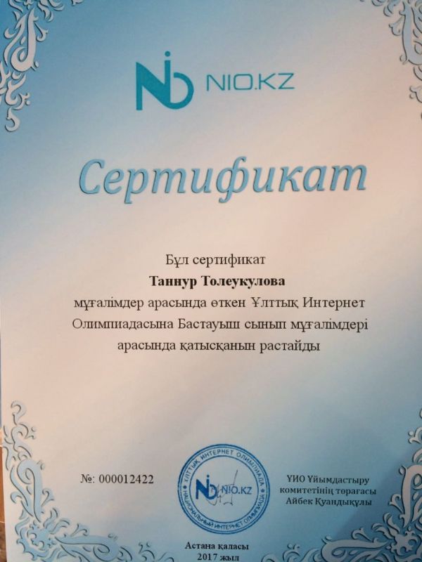 Бастауыш сынып мұғалімдері арасында өткен "Ұлттық Интернет" Олимпиадасына қатысып II ші дәрежелі диплом марапатталды.