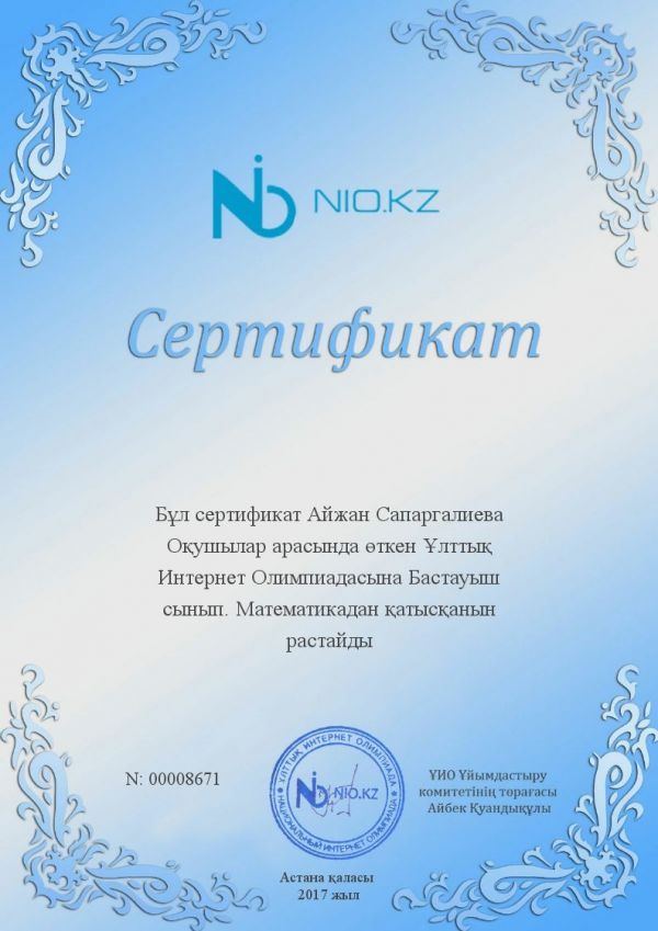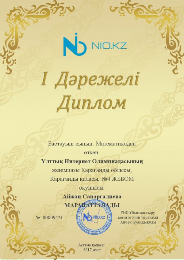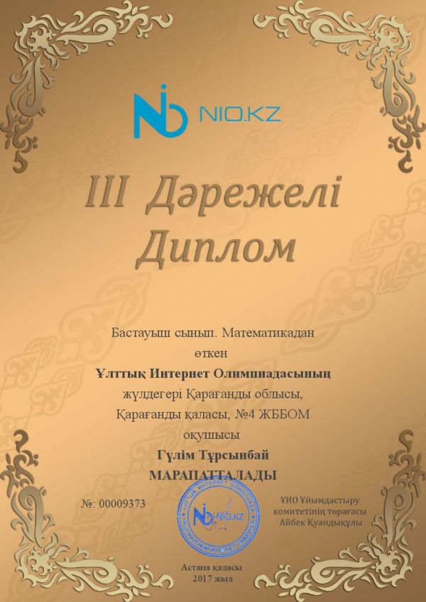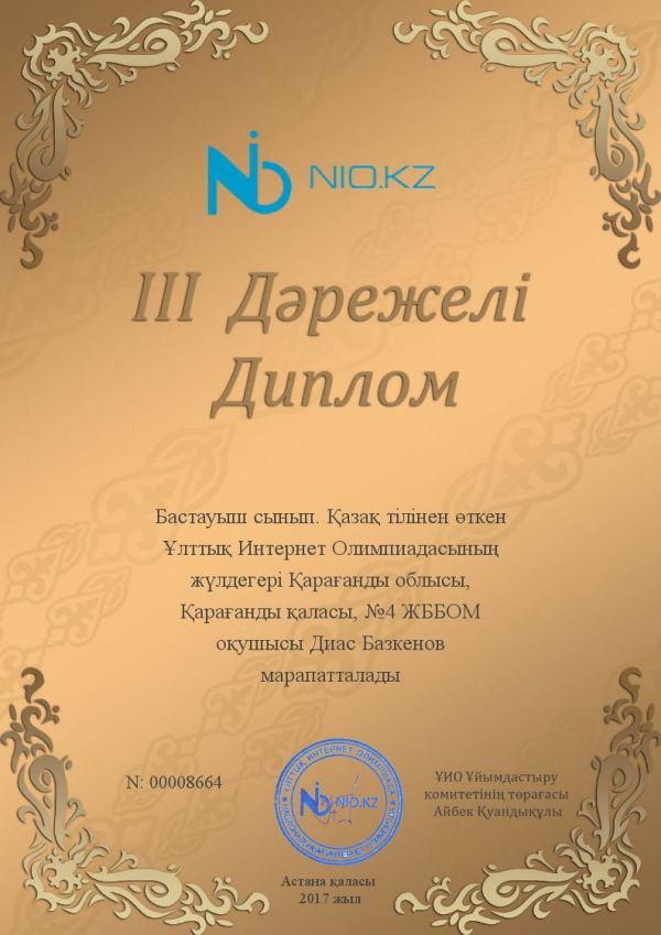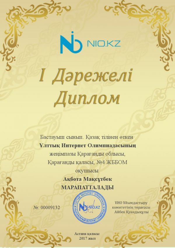 Ұлттық  Интернет Олимпиада қашықтық олимпиадасына  3 – сынып оқушылары қатысып жүлделі орындар иеленді.  I Дәрежелі Диплом және III  Дәрежелі Диплом, Сертификаттармен марап…