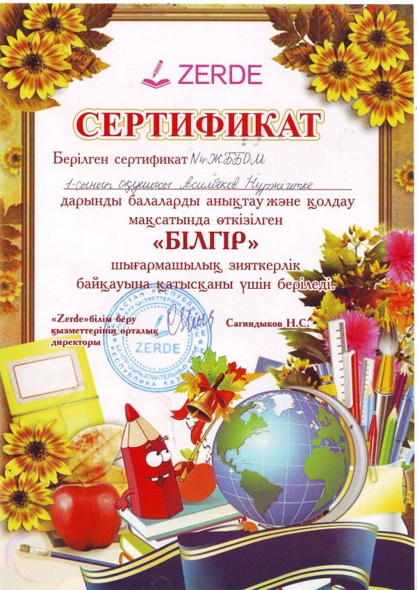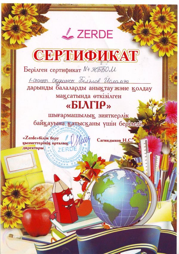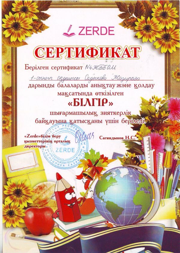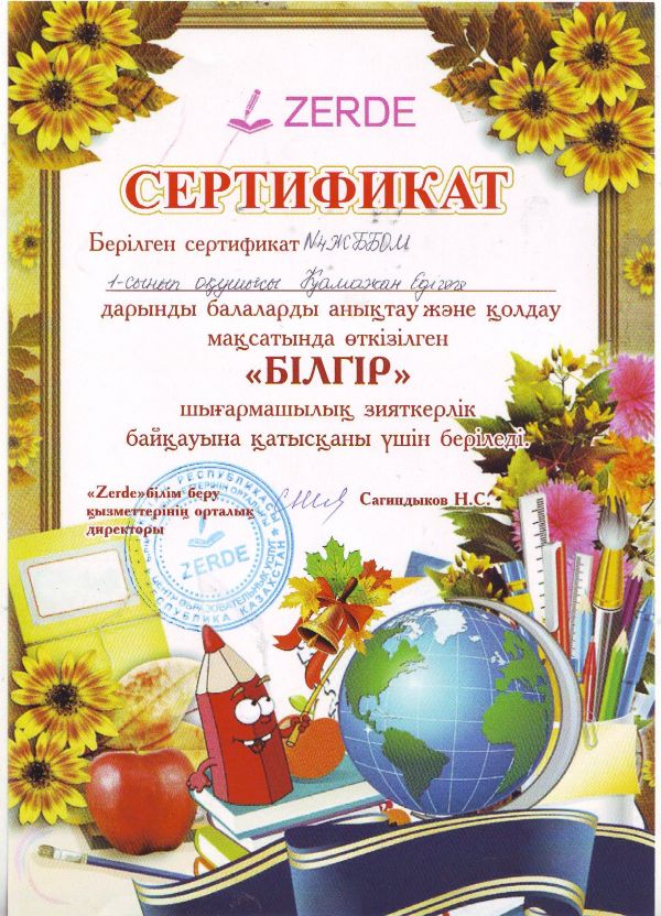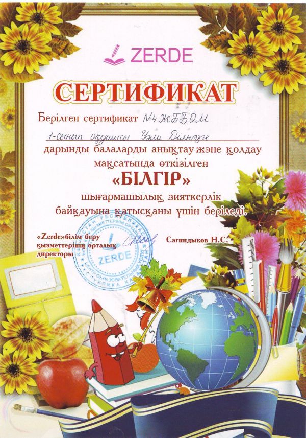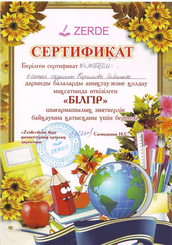 Дарынды балаларды анықтау және қолдау мақсатында өткізілген "Білгір" шығармашылық зияткерлік байқауна қатысқаны үшін 1- сынып оқушылары сертификатқа ие болды.