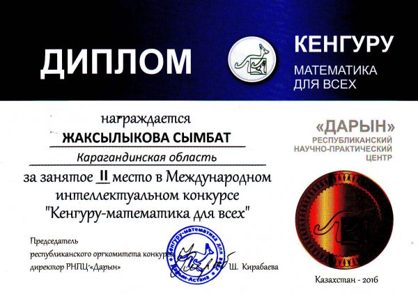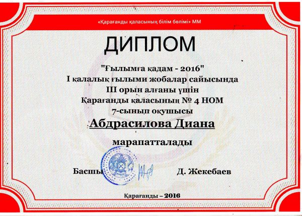 "Ғылымға қадам-2016" І қалалық ғылыми жобалар сайысында ІІІ орын алғаны үшін 7 сынып оқушысы Абдрасилова Диана дипломмен және сол сайысқа қатысқаны үшін 8 сынып оқушысы Бауыржанова Б…