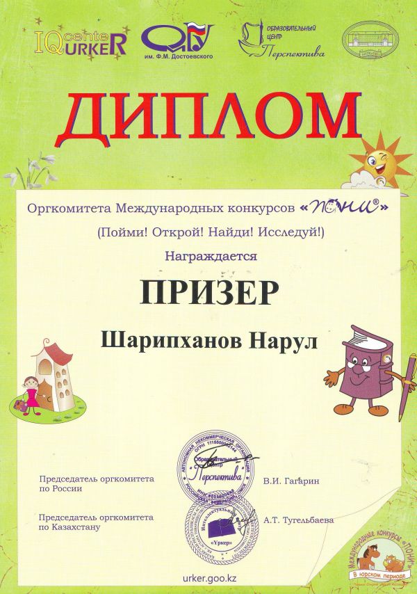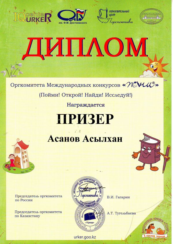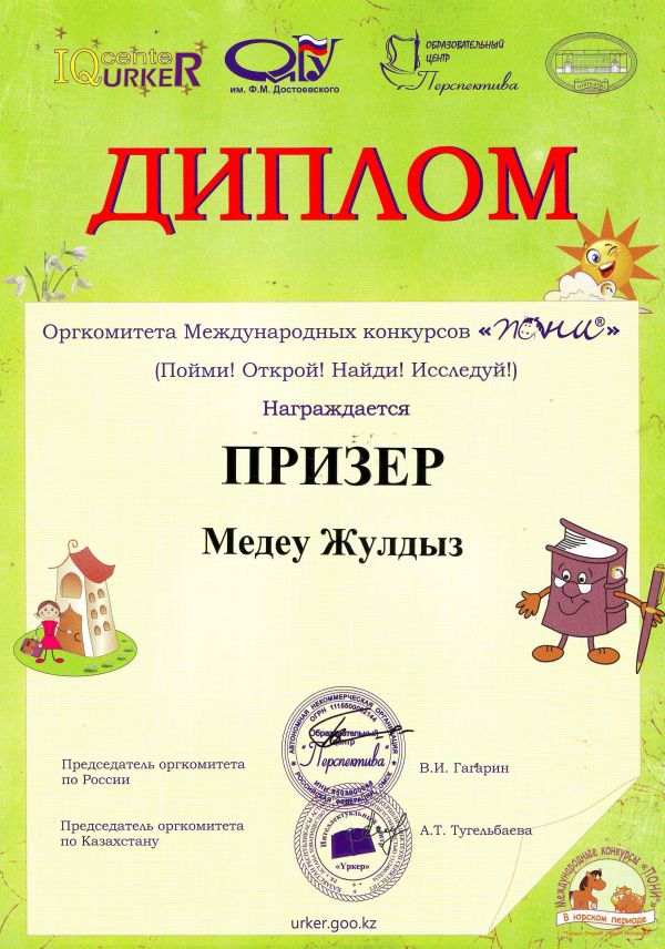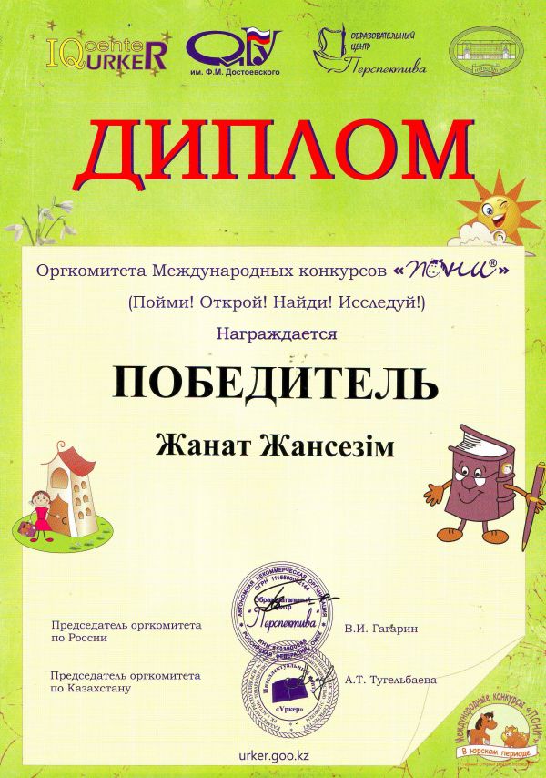 Мектепалды даярлық сыныбының оқушылары "ПОНИ"(Пойми! Открой! Найди! Исследуй!) халықаралық конкурсына қатысып Жанат Жансезім 1 орынға ие болып дипломмен марапатталды. Сонымен қатар Медеу Ж…