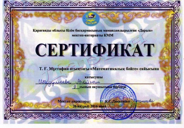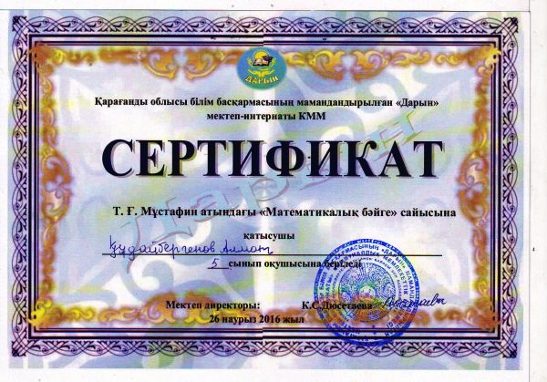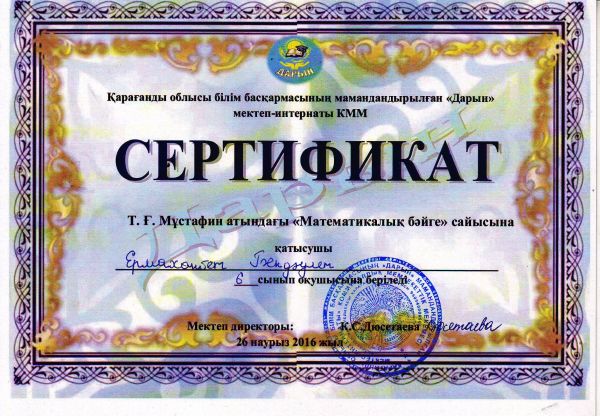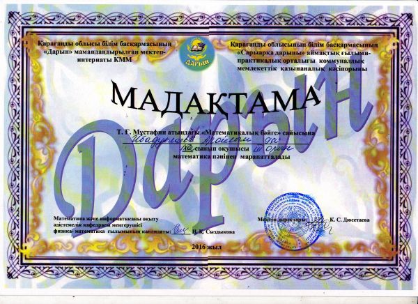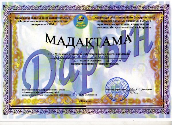 "Дарын" мамандандырылған мектеп-интернатында өткен Т.Ғ.Мұстафин атындағы "Математикалық бәйге" сайысынан ІІІ орын алғаны үшін 6 сынып оқушысы Ермаханбет Бекдәулет, 5 сынып оқушыс…