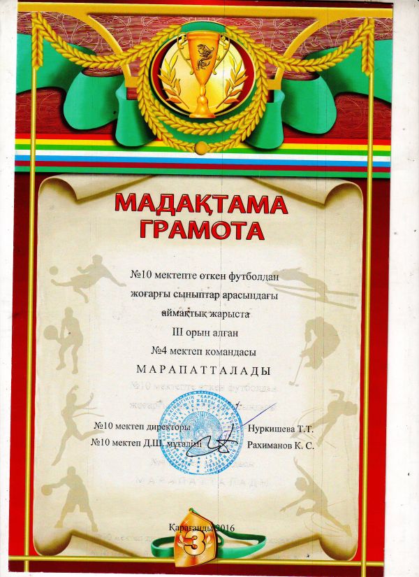 №10 мектепте өткен жоғарғы сыныптар арасында өткен аймақтық жарыста баскетболдан ІІ орын алған, футболдан ІІІ орын алған және волейболдан ІІІ орын алған №4 НОМ командасы мадақтамамен марапатталды.