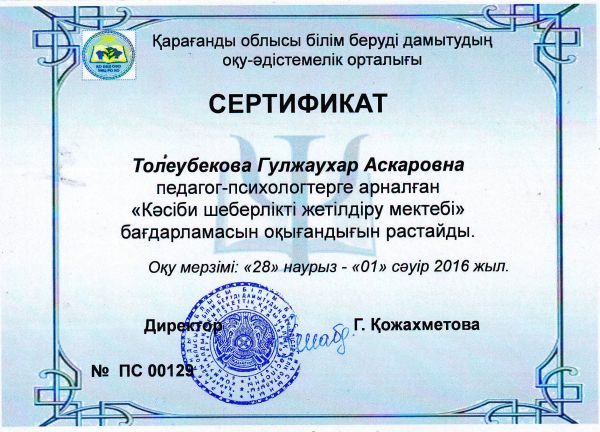 Мектебіміздің педагог-психологі Толеубекова Г.А. педагог-психологтерге арналған "Кәсіби шеберлікті жетілдіру мектебі" бағдарламасын оқып, сертификатқа ие болды.