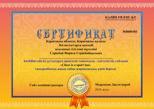 Kazbilim-edu.kz ұстаздарға арналған танымдық-әдістемелік сайтына "Chess is a sport" тақырыбында ашық сабақ жариялағаны үшін мектебіміздің мұғалімі Серікбай Фариза сертификатқа ие болды.&nb…
