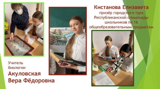 16 жалпы білім беретін пәндер бойынша оқушылардың республикалық олимпиадасының қалалық турында биология пәні бойынша екінші орын алған 10а сынып оқушысы Кистанова Елизаветаны құттықтаймыз. Биология…