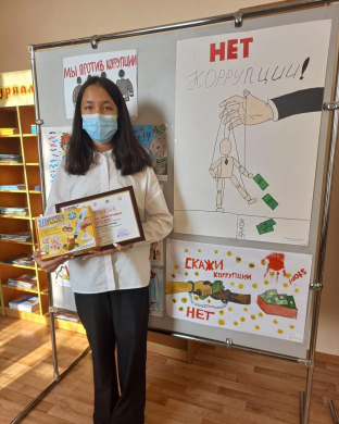 "Сыбайлас жемқорлыққа жол жоқ" атты қалалық ұран-плакаттар байқауында "Ең үздік креативті" номинациясымен 8 "Ә" сынып оқушысы Беркинова Инкар марапатталды.