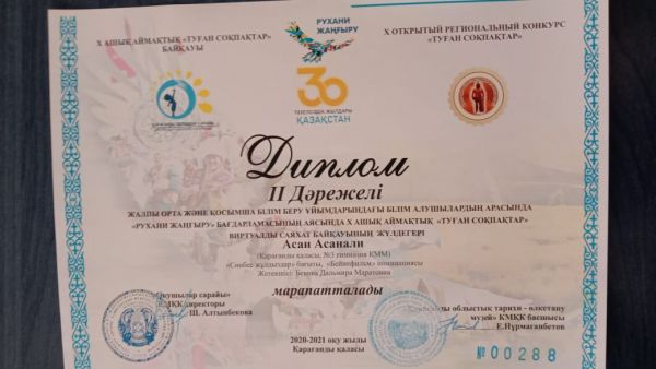 Поздравляем ученика 6 в класса Асан Асанали за занятое 2 место в городском конкурсе "Туған соқпақтар".