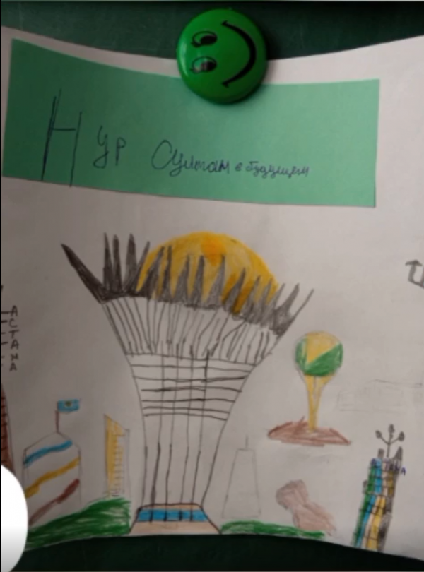 Тұңғыш Президент күні мерекесіне орай ұйымдастырылған "Нұрсұлтан -болашақтың қаласы" атты сурет көрмесін 3 сынып оқушылары ұсынады.