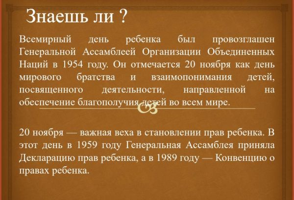 Сен білесің бе? 1954 жылы БҰҰ-ның Бас Ассамблеясы барлық елдерге бейбіт бауырластық күні ретінде, сондай-ақ бүтін әлемдегі балалардың есен-саулығы мен олардың өзара түсіністігін қамтамасыз ету үші…