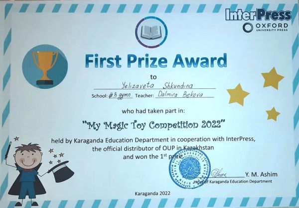 Поздравляем ученицу 4а класса КГУ "Гимназии №3" Шкундину Елизавету с победой в конкурсе "Mymagictoycompetition 2022" организованный Департаментом образования г.Караганды совместн…