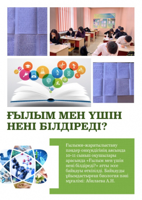 В рамках декады естественнонаучных дисциплин среди учащихся 10-11 классов проведен конкурс эссе "Ғылым мен үшін нені білдіреді?", в котором ребята проявили свои литературные способности, п…