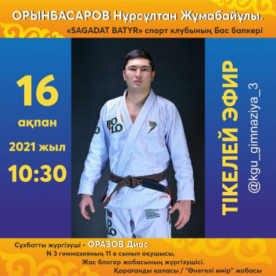16.02.21 күні «Өнегелі өмір» жобасы аясында ұйымдастырылған сұхбат спорт саласына, салауатты өмір салтын насихаттауға арналды. Бүгінгі сұхбатымыз – танымал ММА шебері, джиу-джитсу…