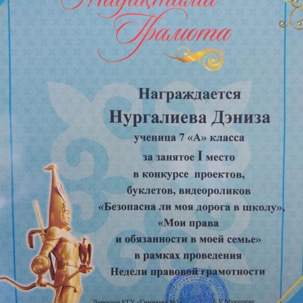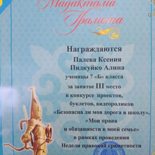 8-9 сыныптар аралығында өткен «Құқықтық вернисаж» плакаттар конкурсы бойынша 9 "Ә" сыныбының оқушылары салған плакаттары бойынша видеоролик түсірді.