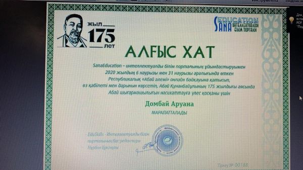 5а -сынып оқушылары Домбай Аруана мен Тарасов Сергей қазақ тілі мен әдебиетінің мұғалімі Мустояпова Әлия Жумабековнаның жетекшілігімен 2020 жылдың 6 наурызы мен 31 наурызы аралығында SanaEduca…