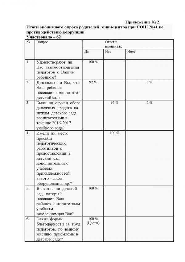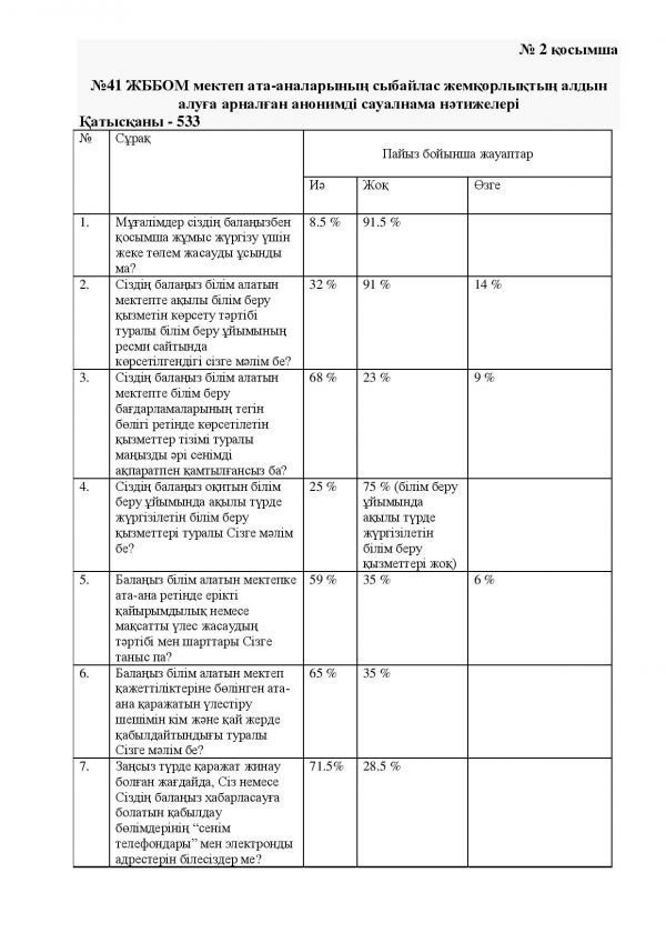 мектеп ата-аналарынан алынған сыбайлас жемқорлықтың алдын алуға арналған анонимді сауалнама нәтижелері