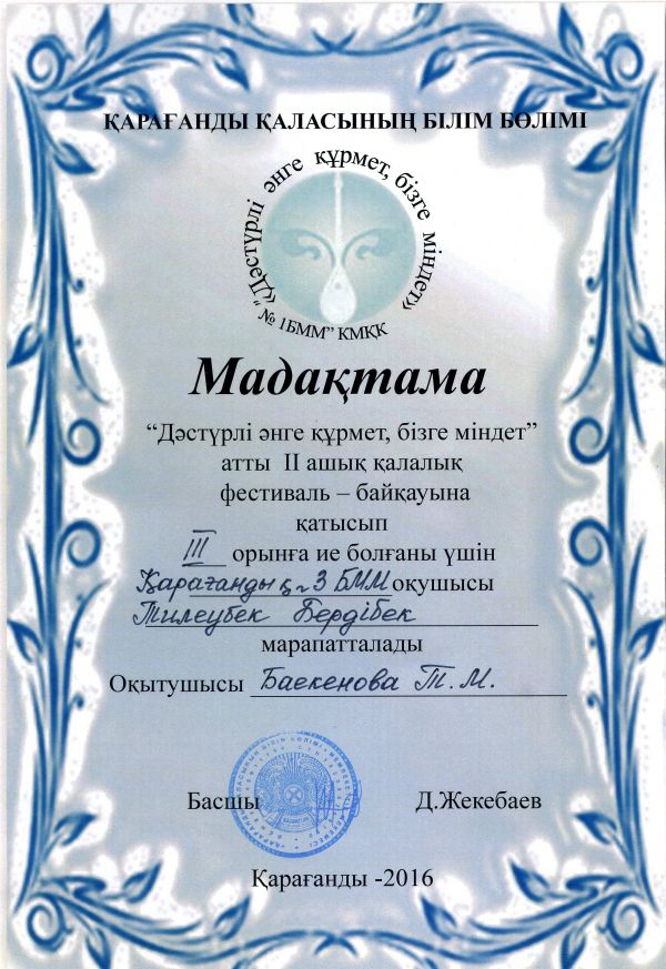 Мектебіміздің 4 А сынып оқушысы Тилеубек Бердібек "Дәстүрлі әнге құрмет, бізге міндет" атты ІІ қалалық фестиваль - байқауына қатысып, ІІІ орынға ие болды. Құттықтаймыз!!!
