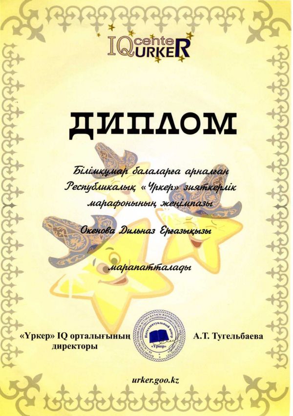 Білімқұмар балаларға арналған Республикалық «Үркер» зияткерлік марафонының жеңімпазы «Балдәурен» ересек тобының тәрбиеленушісі Окенова Дильназды 1-орын Дипломымен құттықтаймы…