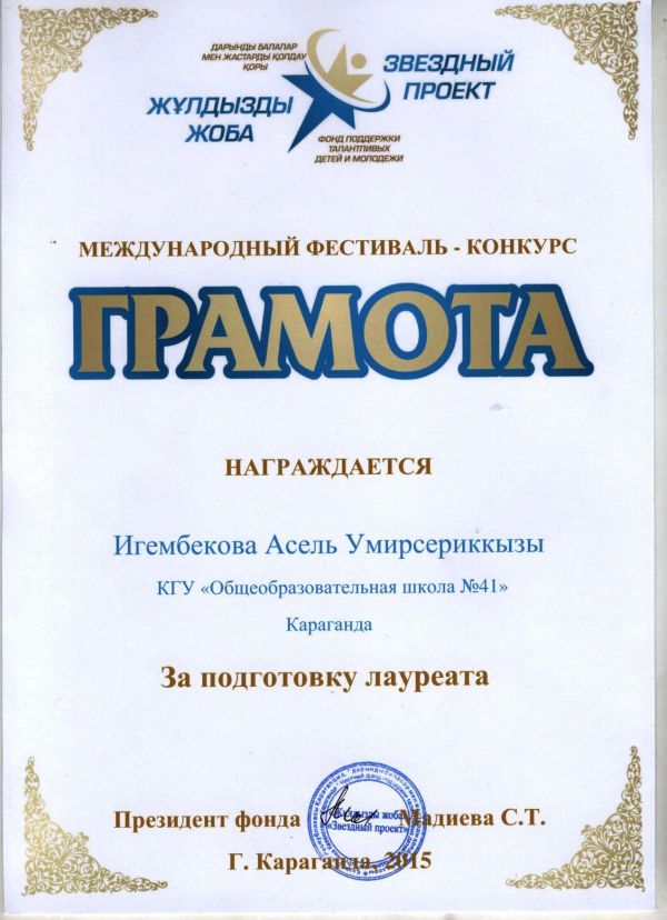 2015 жылдың 13 желтоқсан күні дарынды балалар мен жастарды қолдау қоры ұйымдастыруымен "ЖҰЛДЫЗДЫ ЖОБА" ХАЛЫҚАРАЛЫҚ ӘН-БИ ФЕСТИВАЛІНЕ мектебіміздің 1 сынып оқушысы Нәрікбай Дінмұхаммед қаты…
