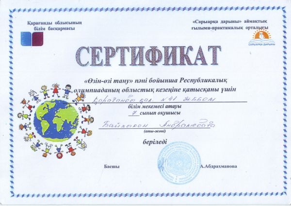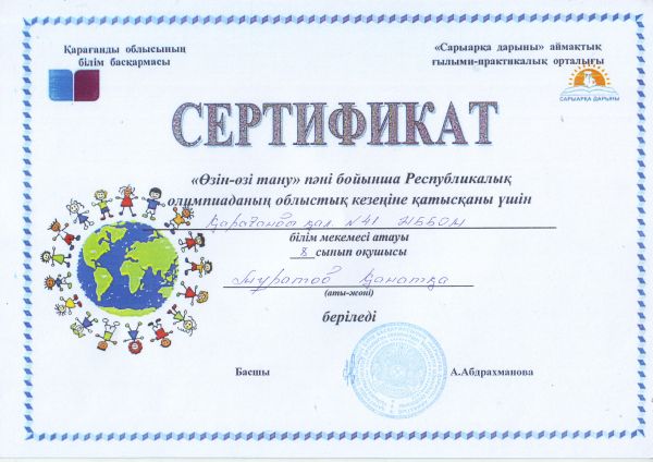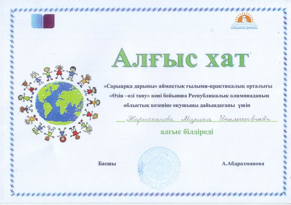 “Сарыарқа дарыны” аймақтық ғылыми-практикалық орталығы “Өзін-өзі тану” пәні бойынша Республикалық олимпиаданың облыстық кезеңіне қатысқаны үшін жетекші Сейтжанова Т.Ғ. және о…