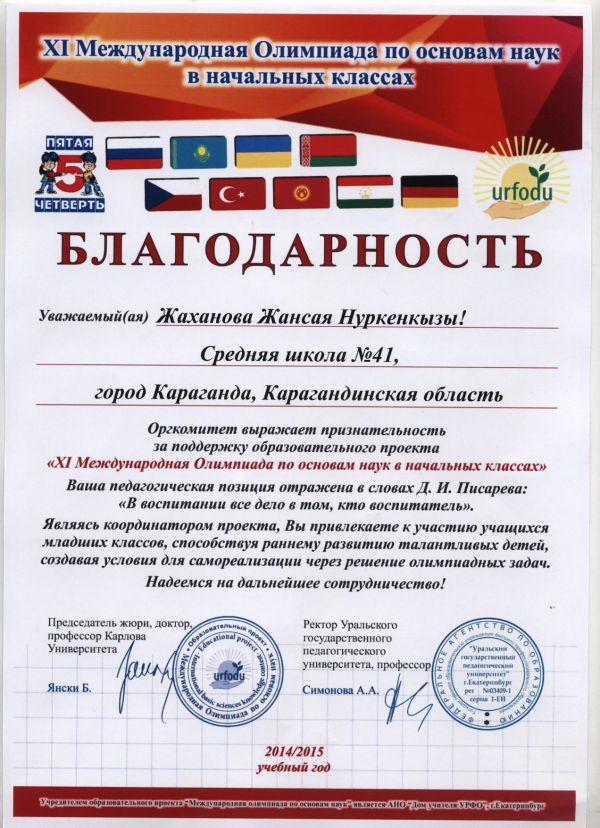 20.04.2015ж. №41 ЖББОМ бастауыш сыныптар арасында негізгі пәндерден, XI халықаралық олимпиадасында, 2014-2015 оқу жылы интелектуалдық жобасына оқушыларды дамытуда үлес қосқаны үшін сертификат берілд…