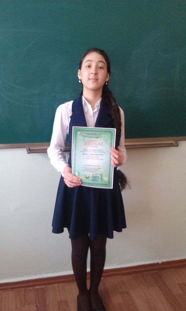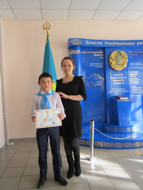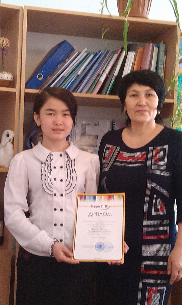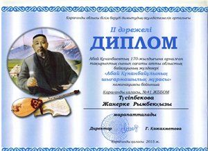 Абай Құнанбаевтың 170 жылдығына арналған тақырыптық сынып сағаты атты облыстық байқауының «Абай Құнанбайұлының шығармашылық мұрасы» номинациясы бойынша ІІ дәрежелі диплом алғаны үшін қаз…