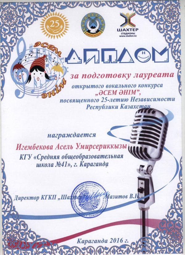 Қазақстан Республикасы Тәуелсіздігінің 25 жылдығына арналған "Әсем әнім" ан байқауына 3 Ә сынып оқушысы Асхатұлы Нұрислам қатысып, ІІІ орынды иеленді. Жетекшісі Игембекова Асель Умирс…