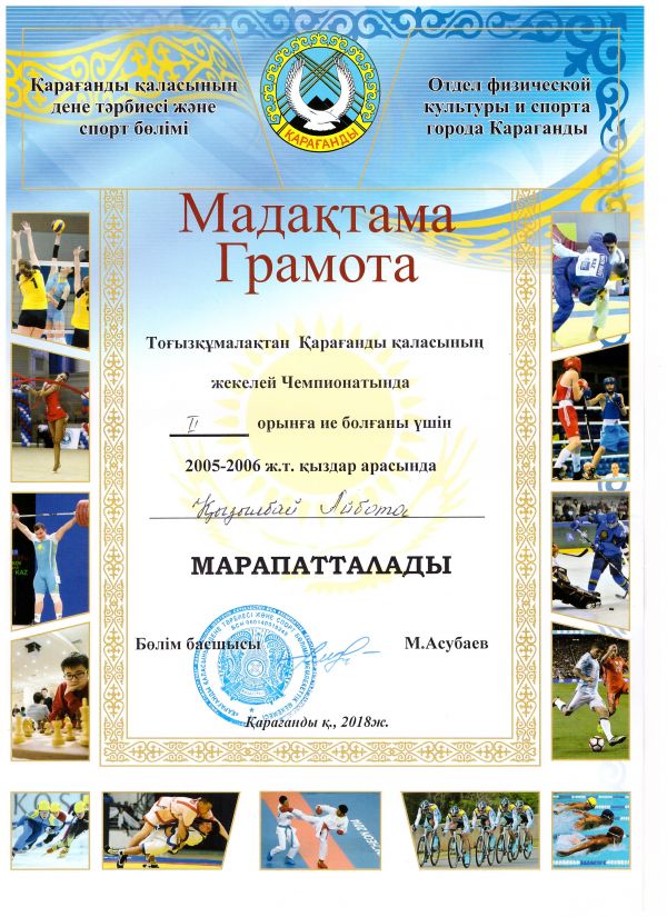 Қарағанды қаласының дене тәрбиесі және спорт бөлімінің ұйымдастыруымен өткен тоғызқұмалақтан Қарағанды қаласының жекелей чемпионатында 2005-2006 ж.т. қыздар арасында мектебіміздің 7 ә сынып оқушысы…