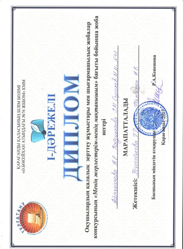Ағылшын тілі пәні бойынша Республикалық қашықтық олимпиадасына қатысып, 2 орын алғаны үшін мектебіміздің 8 "А" сынып оқушысы Досмаганбетов Ануар және 3 орын алғаны үшін 9 "Ә&quo…