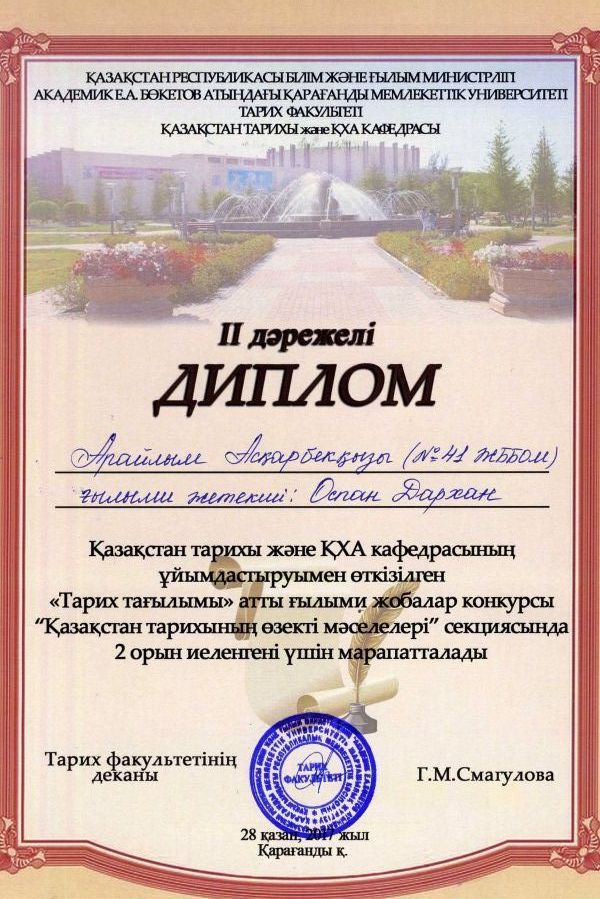 Қарағанды қаласының орта мектептер оқушылары арасында тоғызқұмалақтан қалалық жарысында IIорынға ие болғаны үшін