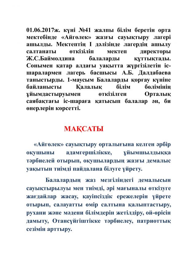 02.06.2017 ж. күні «Айгөлек» жазғы сауықтыру лагерінде 2017 жылдың 1-12 маусым аралығында еліміздің барлық өңірлерінде 12 - «Бала еңбегін қанауға қарсы 12 күн» іс-шарасы…